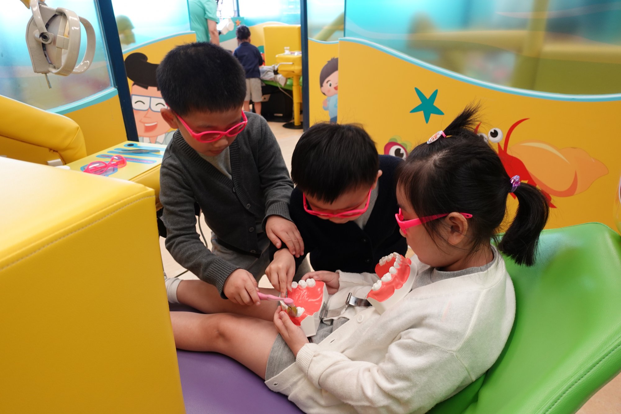 2. 好玩牙科診所,認識每年檢查牙齒的習慣。幼兒先觀看一套介紹「好玩牙科診所」的卡通片,然後到「好玩牙科診所」進行角色扮演。